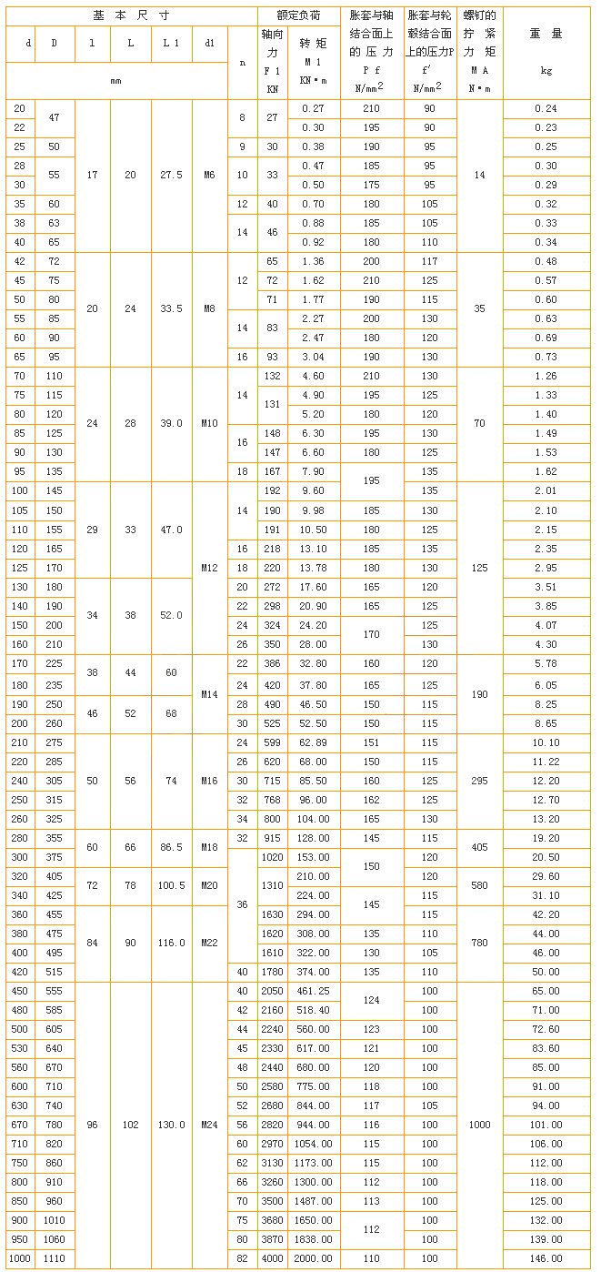 特性:Z2型脹緊套由一個開口的雙錐內(nèi)環(huán),一個開口的雙錐外環(huán)和兩個雙錐壓緊環(huán)組成。用內(nèi)六角螺栓擰緊,擰緊時彈性環(huán)沒有相對于軸轂的軸向移動,與Z1型比較,同樣壓緊力能產(chǎn)生 大的徑向壓力,傳遞 大的載荷。為便于拆卸,在一個壓緊環(huán)上有拆卸用螺孔,沿圓周共有2~4處。鎖緊聯(lián)結(jié)盤廣泛應用于包裝、印刷、紡織、機床等機械上。