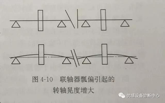 如圖4-10所示,當聯軸器端面與軸中心線不垂直時,螺絲擰緊后,轉子將產生變形,軸頸處出現較大晃度。距離聯軸器越遠,轉子晃度越大。轉子撓曲變形不僅會產生較大的激振力,還會破壞動靜間隙,導致軸承烏金或者汽封等處產生摩擦。