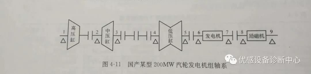 早期的國產200MW汽輪發電機組,如圖4-11所示,中壓和低壓轉子之間有一段跨距為4m、壁厚為0.04m的空心軸,又稱接長軸。該軸段剛性較差,在運行中晃動很大,容易引起3號、4號軸承振動超標,已經成為這類機組的通病。該型機組在運行中應嚴格防止接長軸承受沖擊扭矩如甩負荷、非同期并網等,檢修中應盡可能減小接長軸與轉子對輪組裝后的晃動和瓢偏值。
