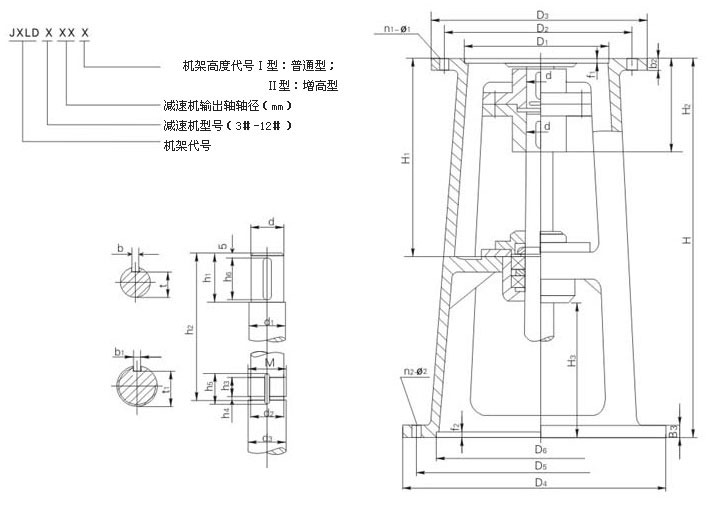 本機(jī)架系列的JXLD型適用于與XLD型擺線針輪行星減速機(jī)及CFL型行星齒輪減速機(jī)連接,JBLD型適用于與BLD型擺線減速機(jī)連接。為使攪拌軸與軸承室裝配、維修方便,本公司對(duì)軸承室結(jié)構(gòu)進(jìn)行改進(jìn)設(shè)計(jì),同時(shí)對(duì)與BLD2、BLD3、BLD4相配的機(jī)架JBLD2,JBLD3JBLD4的軸承室加大,使之與較粗的攪拌軸相一致。